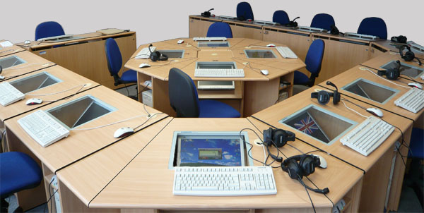Das moderne Sprachlabor befindet sich am Lise-Meitner-Gymnasium in Unterhaching. Die versenkten Monitoren geben den Lehrern eine freie Sicht auf die Schüler.